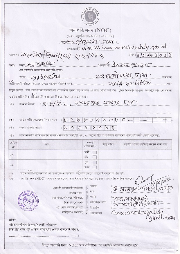 বিষয়ঃ সাভার পৌরসভার সহকারী কর নির্ধারক বেগম তন্দ্রা ইয়াছমিন এর এন ও সি প্রদান প্রসঙ্গে।
